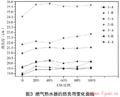 理論上似乎可以用華白數(shù)來預測熱負荷的變化,從100%管輸氣變化到100%LNG,華白數(shù)增加了6%,對于不同品牌的熱水器,熱負荷的增加基本上未超出5%,熱水器1-B達到最高的偏差4.6%。個別點的熱負荷與總體變化趨勢的偏離可以認為是燃氣粘度導致噴嘴流量發(fā)生變化所致。