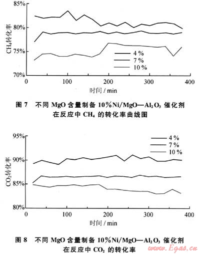 圖7、圖8為不同含量MgO-Al203載體制成10%Ni/MgO-Al203催化劑在反應(yīng)中CH4和CO2的轉(zhuǎn)化率。從圖7、8中可以看出,在反應(yīng)過(guò)程中10%Ni/4%MgO-Al203催化劑的催化活性最高,CH4和CO2轉(zhuǎn)化率分別為82%和90%左右。隨著反應(yīng)的進(jìn)行,10%Ni/4%MgO-Al203催化劑的催化活性略有浮動(dòng),但其轉(zhuǎn)化率仍然較高,在整個(gè)反應(yīng)過(guò)程中催化劑的催化活性變化都不是很大,表明其穩(wěn)定性較好。
