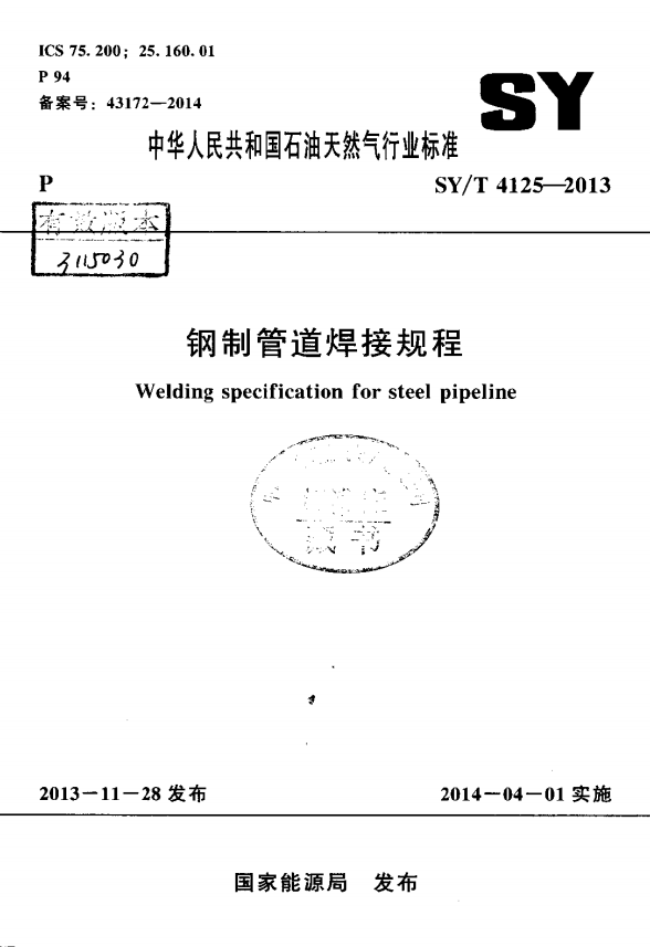 鋼制管道焊接規(guī)程 SY/T 4125-2013 :本規(guī)程適用于輸送介質(zhì)為氣體、液體和漿體的長輸管道及油氣田集輸管道的安裝焊接,管道材質(zhì)為碳素鋼、低合金鋼、奧氏體不銹鋼、不銹鋼復(fù)合管.焊接方法為鎢極氬弧焊、焊條電弧焊、熔化極氣體保護(hù)電弧焊(包括自保護(hù)半自動焊、氣保護(hù)半自動焊、氣保護(hù)自動焊)、埋弧焊,以及上述焊接方法相互組合的方法。